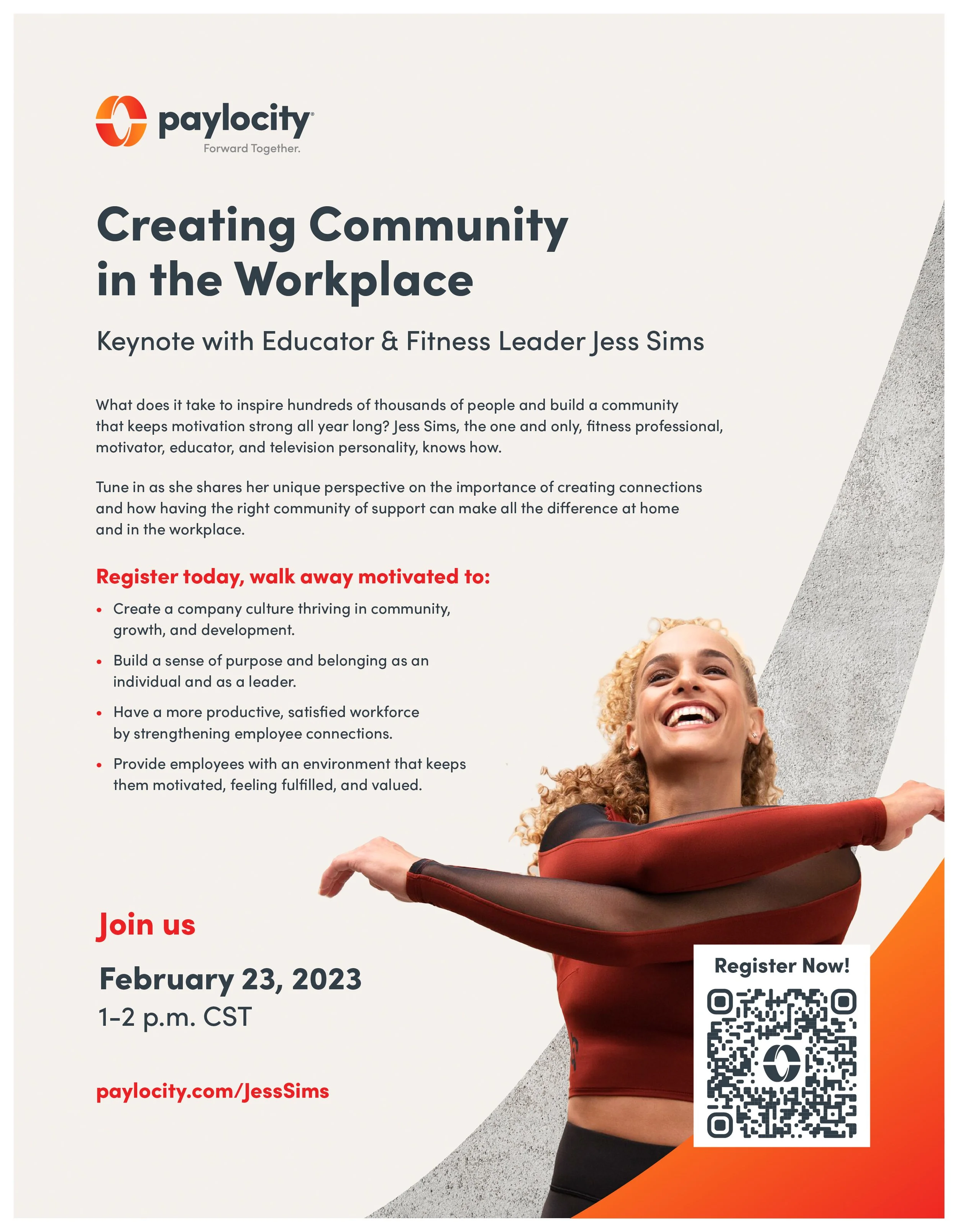 Paylocity hosted a virtual keynote event for prospective clients, clients, and partners featuring educator and fitness professional Jess Simms called: Creating Community in the Workplace. The resulting work brought the energy and optimism that Jess brings to every endeavor she takes on.